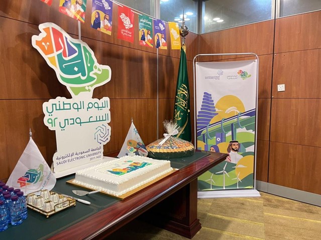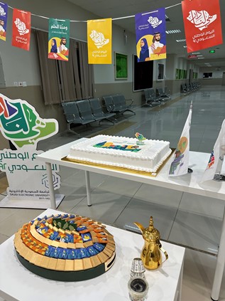 On the evening of Sunday, September 25, 2022, the Saudi University branch in Jazan held a celebration on the occasion of the anniversary of the 92nd National Day of the Kingdom of Saudi Arabia, in the main lobby of the branch for both halves, in the presence of the branch’s general supervisor, Dr. Ahmed Faqihi, in the students’ section and the assistant general supervisor A. Maha Al Khairat in the female section, faculty members and branch employees from the administrative staff, in addition to male and female students. This precious anniversary comes to commemorate the exploits of the leaders of this country, led by King Abdulaziz Al Saud - may God have mercy on him - the founder and unifier of the Kingdom, and his sons who succeeded him After him: King Saud, King Faisal, King Khalid, King Fahd, King Abdullah - may God have mercy on them - and King Salman bin Abdulaziz, and his trusted Crown Prince Muhammad bin Salman - may God protect them - who led the country to safety and brought about a developmental renaissance in various fields. The fields were prepared and arranged for this celebration by the coordinators of student activities and public relations in the branch.