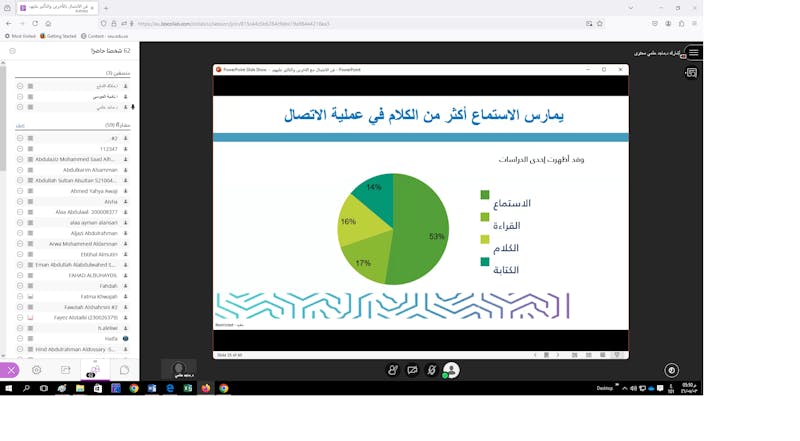 The Saudi Electronic University branch in Al -Madinah Al -Munawwarah, On Tuesday, 03 Jumada al-Awwal 1446 AH, the course (Communication and Influencing Others) was held, which was held via the electronic platform (Blackboard) and presented by faculty member Dr. Majid Abdel Raouf Helmy, which targeted male and female students in all branches. The training course dealt with learning about the concept of communication and how its stages develop over the years, and learned about the types of people and how to deal with each style of communication, receiving information, the effectiveness of effective communication in the organization, and the most important communication skills.